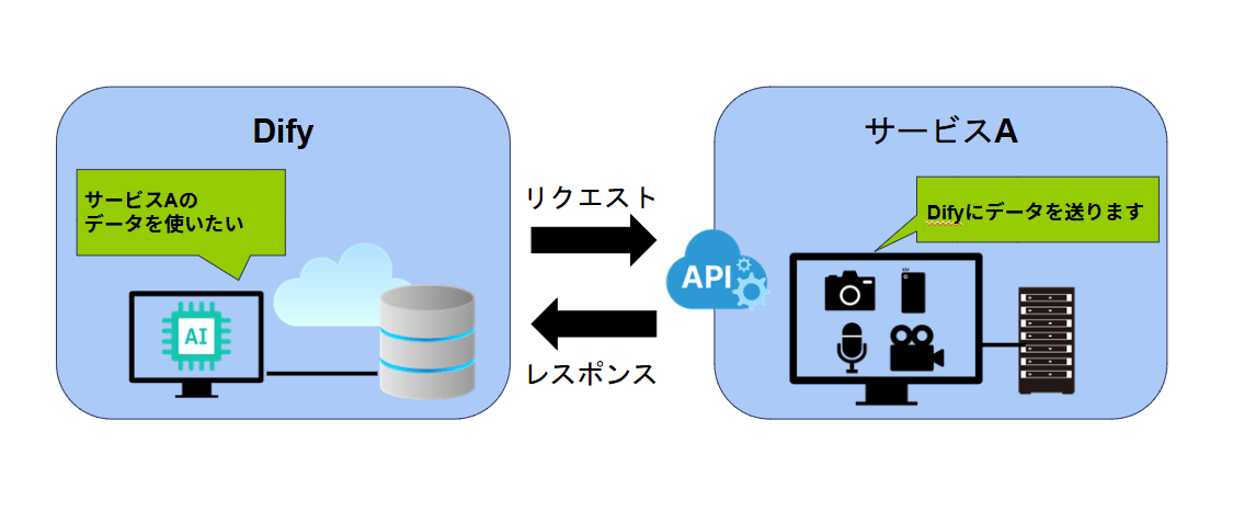Difyは「REST API」という汎用的な通信方式に対応しており、社内システムや外部SaaSなど、ほぼすべてのWebアプリケーションとデータをやり取りできます。