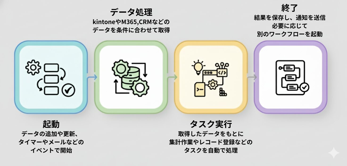 n8nは、kintoneをはじめとした多様なシステムを連携させ、タスクを自動で実行する「ワークフロー」を構築できるツールです。ワークフローを構築することにより、これまで手作業で対応していたデータ連携をスムーズに自動化できます。