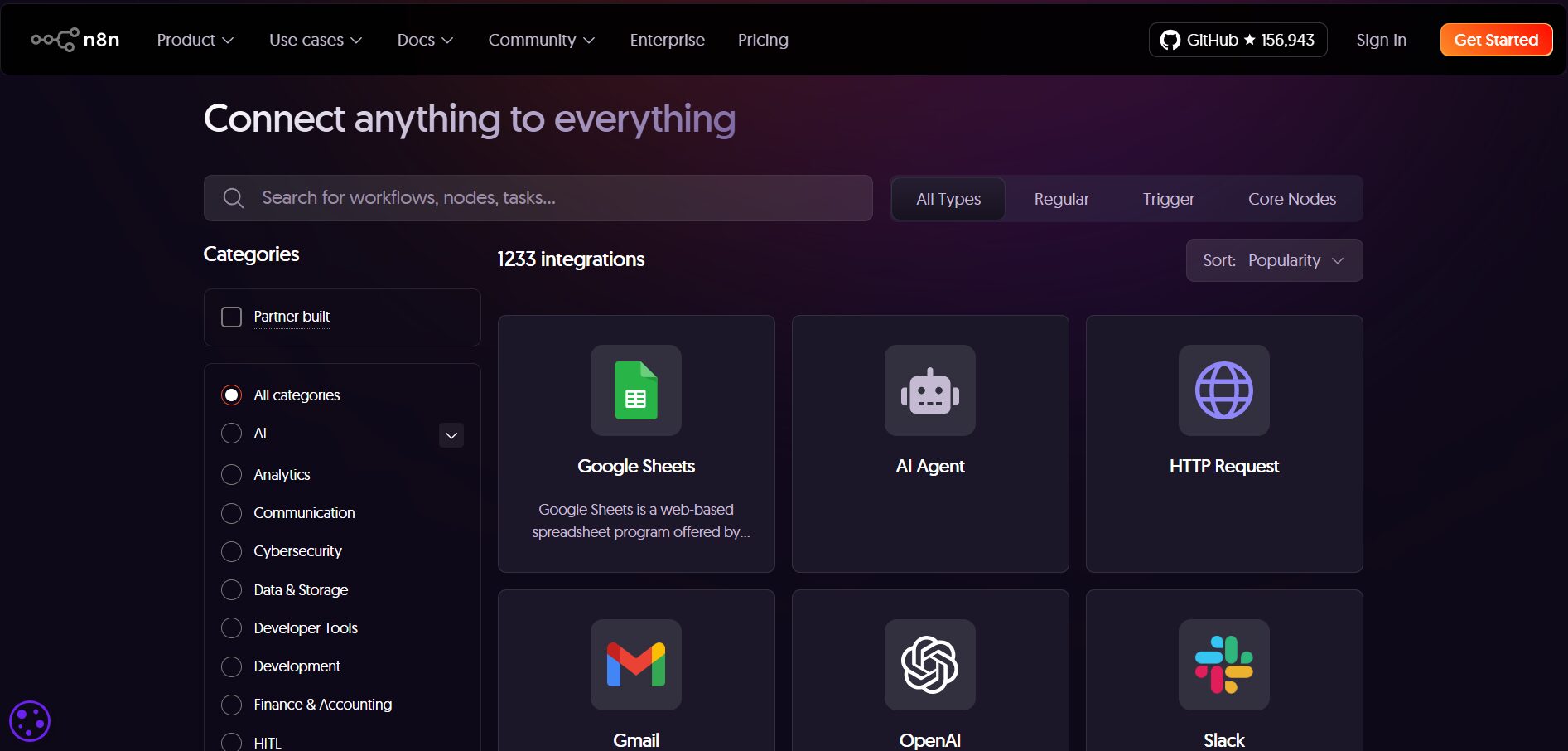 n8nは公式に「500以上のアプリやサービスと連携可能」と明記されています。この連携の幅はkintoneよりも広く、さまざまなシステムを統合したワークフローを実現できます。連携方法には「公式ノード」と「HTTPリクエストノード」があり、用途に応じて使い分けられます。