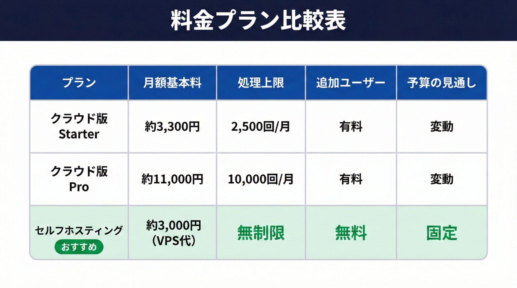 料金プランの詳細は、別記事「【超入門】n8nとは?」の料金セクションで解説しています。ここでは、製造業特有の事情から見たセルフホスティングの優位性を説明します。