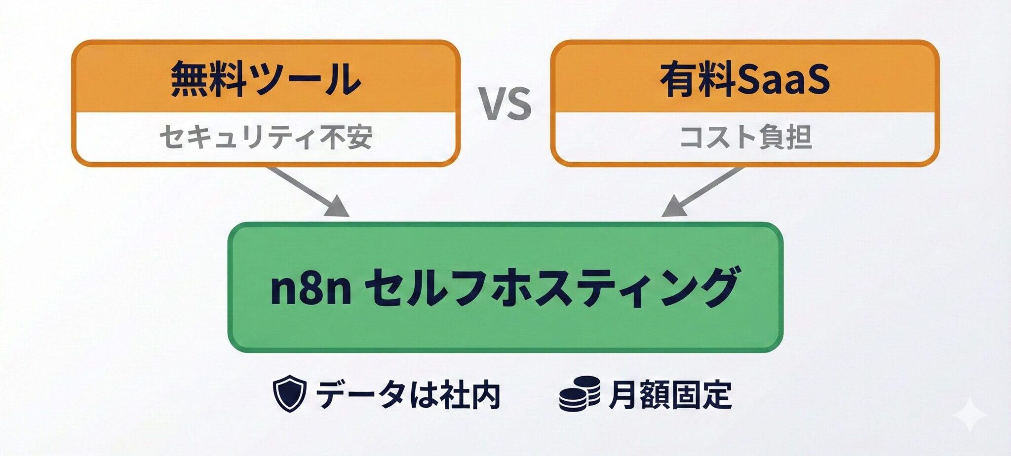 一方で、有料のSaaSは月額費用が高く、稟議が通らないケースも多いでしょう。n8nには、この2つの課題を同時に解決できる「セルフホスティング」という選択肢があります。