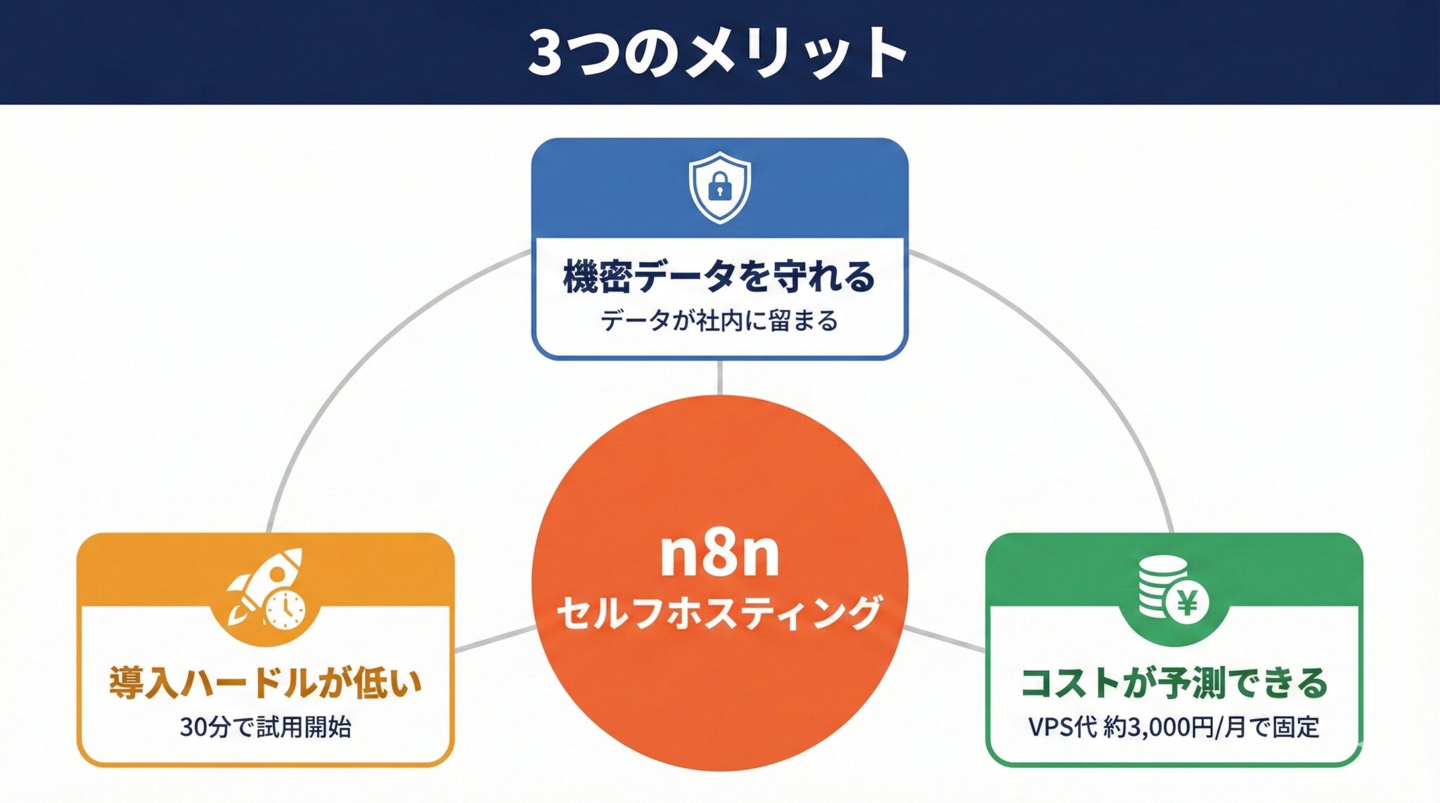 実は、n8nのセルフホスティングを使えば、機密データを社外に出さず、月額約3,000円で業務自動化を実現できます。