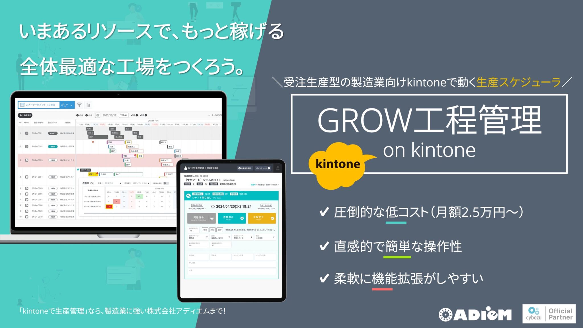 「GROW工程管理 on kintone」は、多品種小ロット・受注生産型の製造業に特化した、kintone上で動く工程管理・生産スケジューラです。