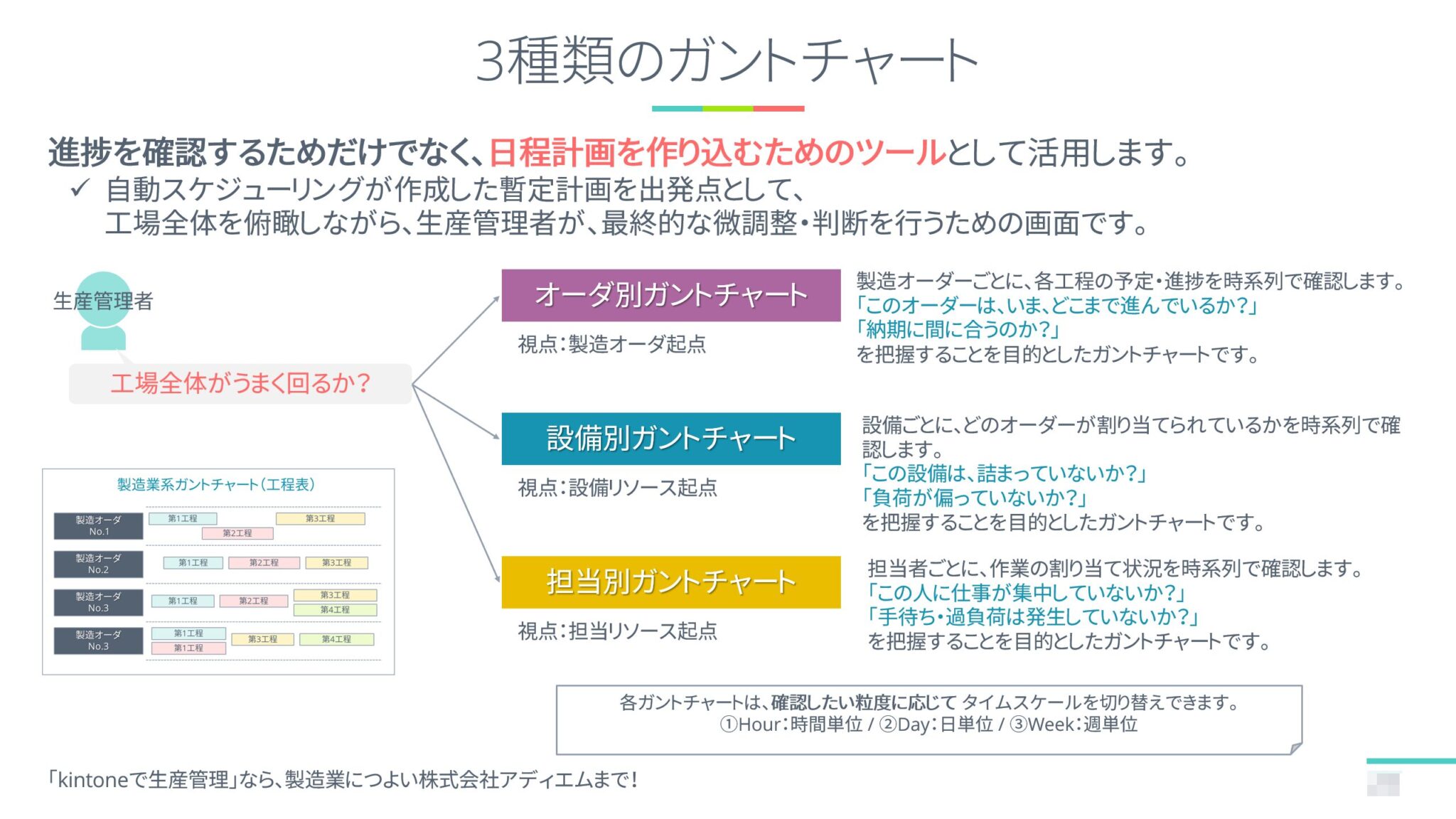 - リソース(設備・人)の割当や負荷バランスの調整が難しい。