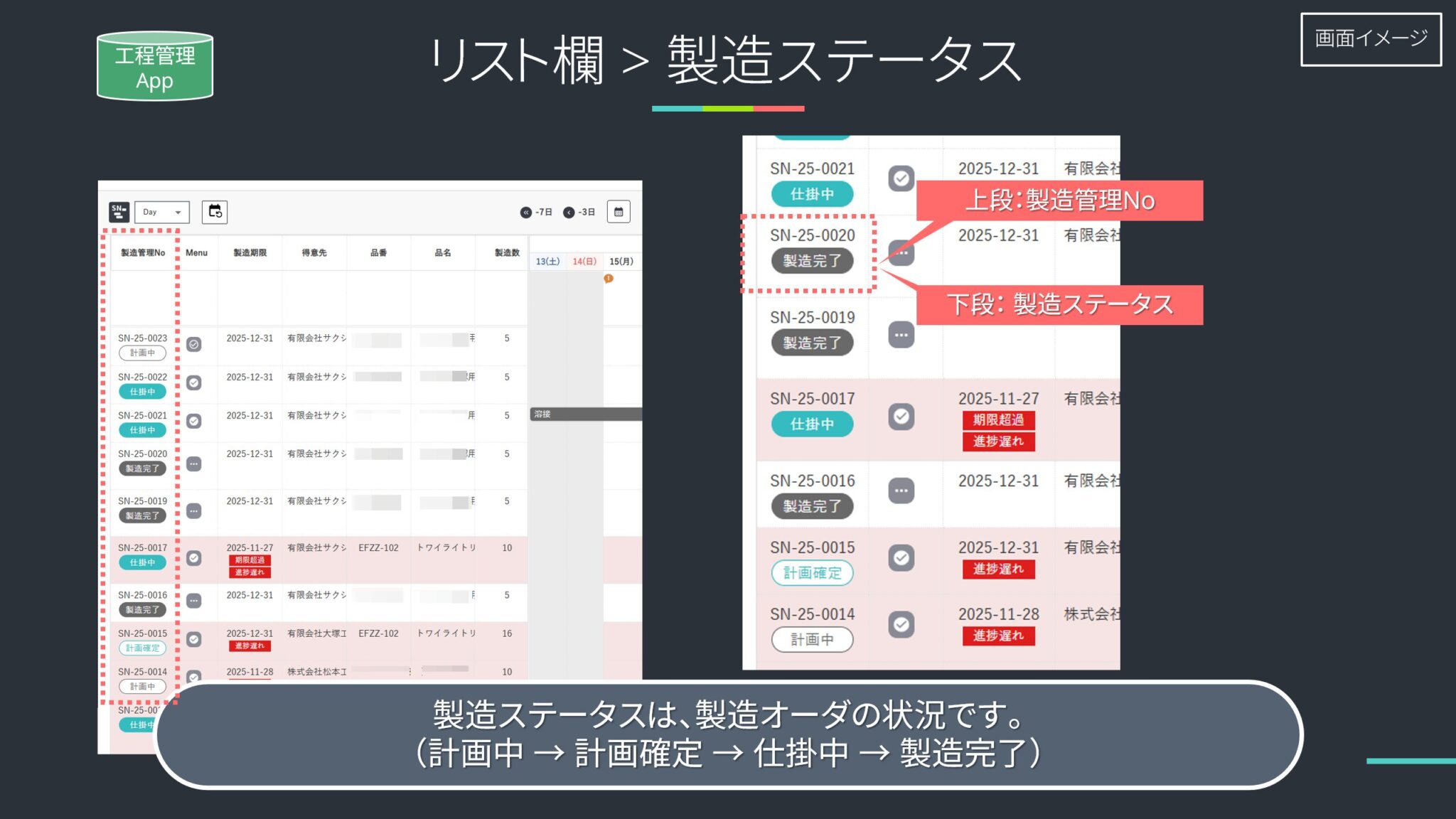 | 遅延マーク | 工程単位 | 作業終了予定日時を現在時刻が過ぎているにもかかわらず「完了」になっていない工程に表示 |