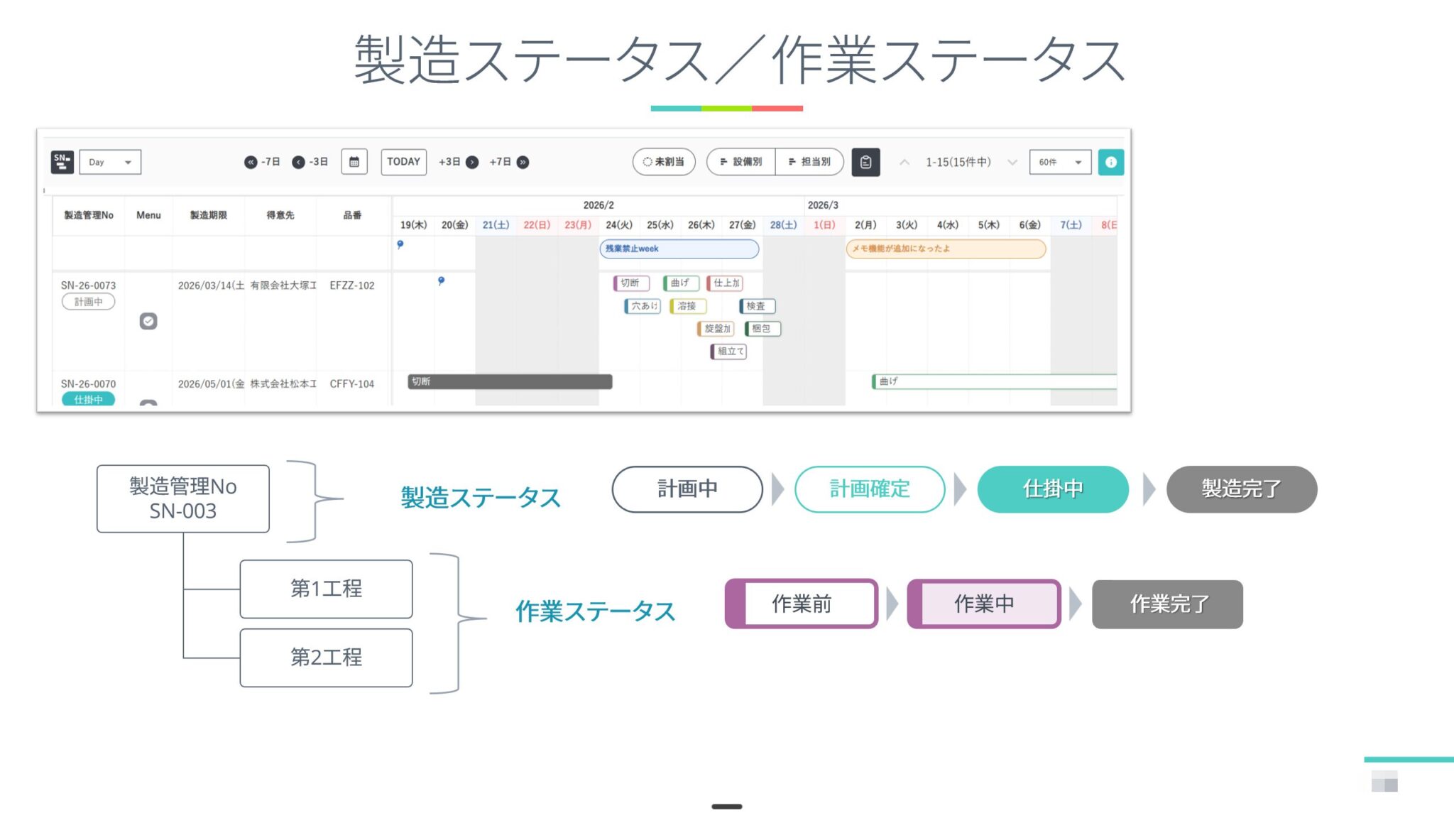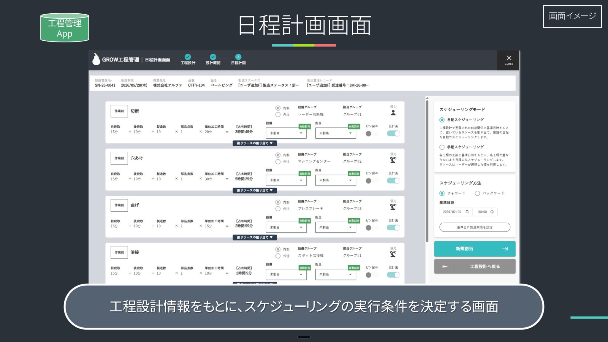 | 工程一覧 | 各工程の担当・設備・予定日時 |