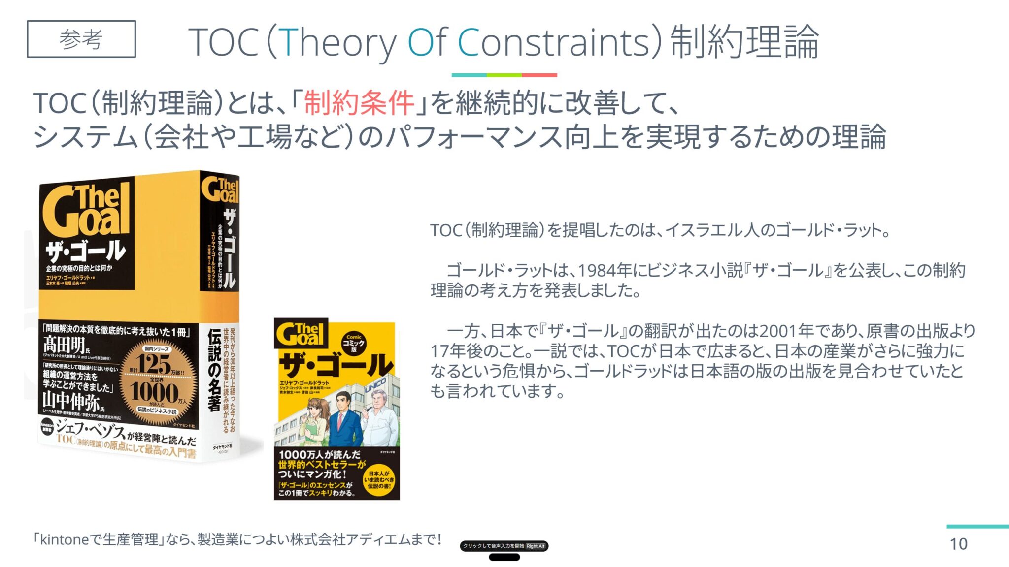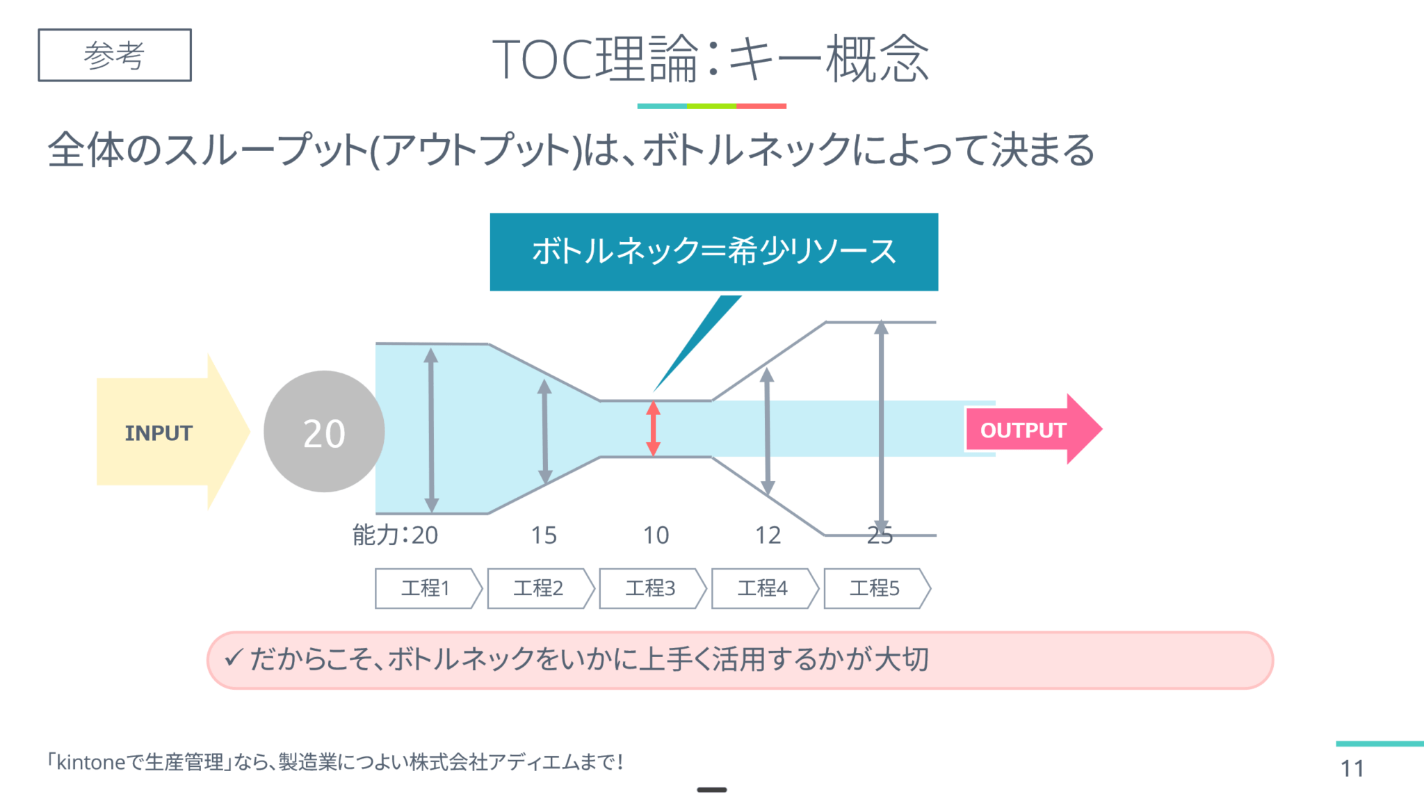 - TOC理論とは、ボトルネック工程に着目して、全体最適化を図る理論。固定費を増やさずに、工場の生産性を向上することができます。