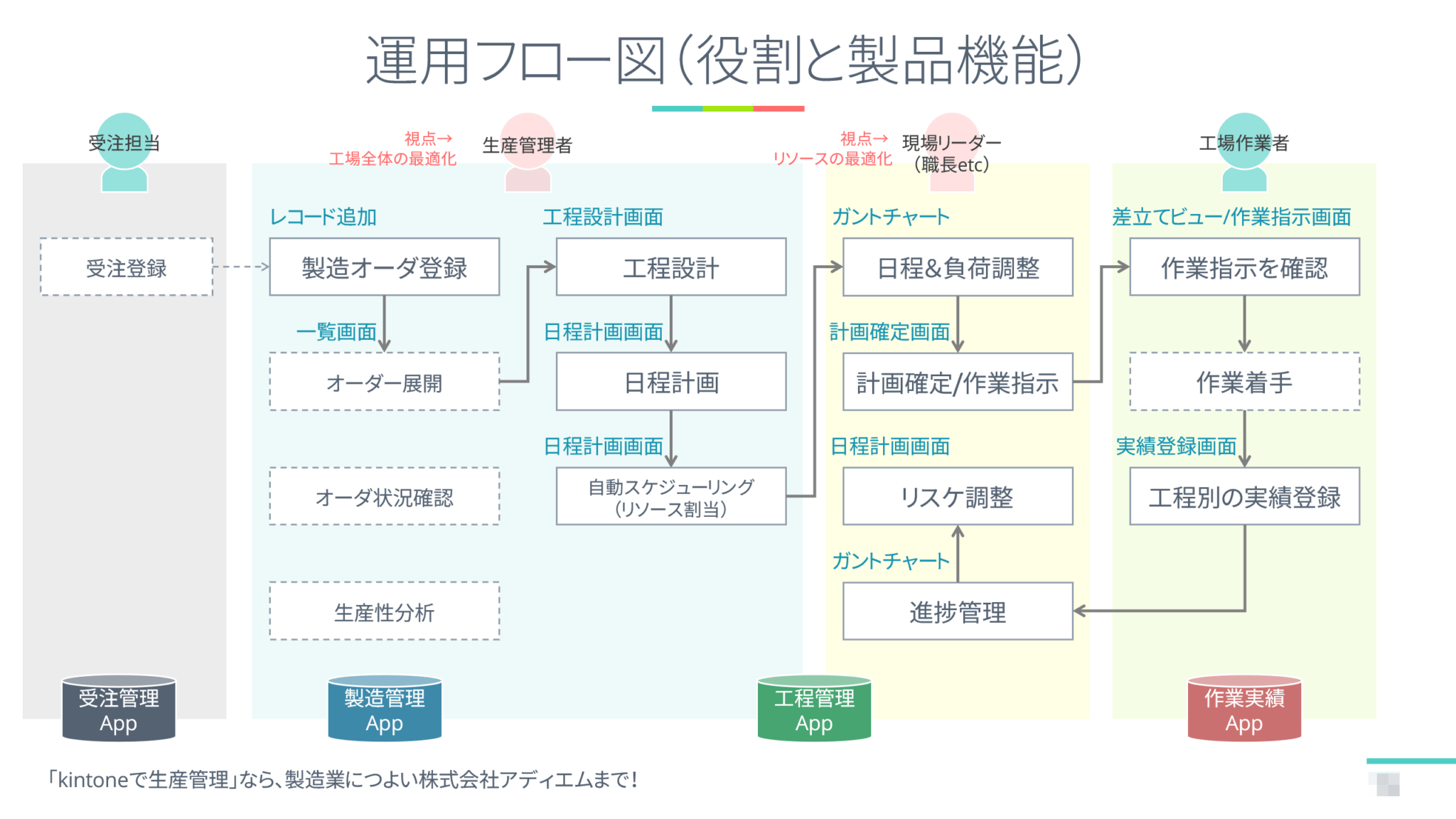 受注登録 → 製造オーダ登録 → 製造工程設計 → 日程計画 → 日程調整・指示 → 作業実績登録 → 分析・改善