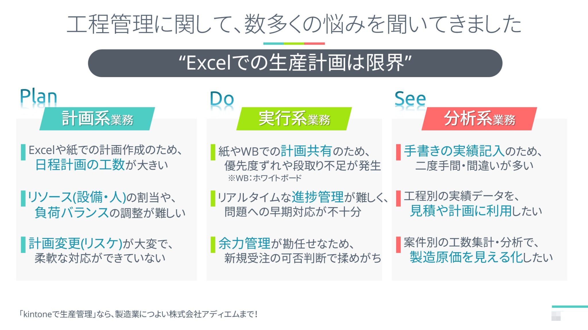 - 紙やホワイトボードでの計画共有では、優先順位のズレや段取り不足が発生する。