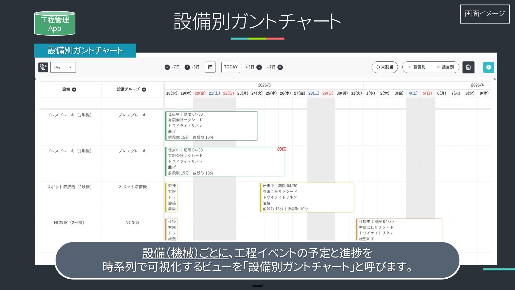 - 設備別ガントチャート:設備の負荷が偏っていないかを確認