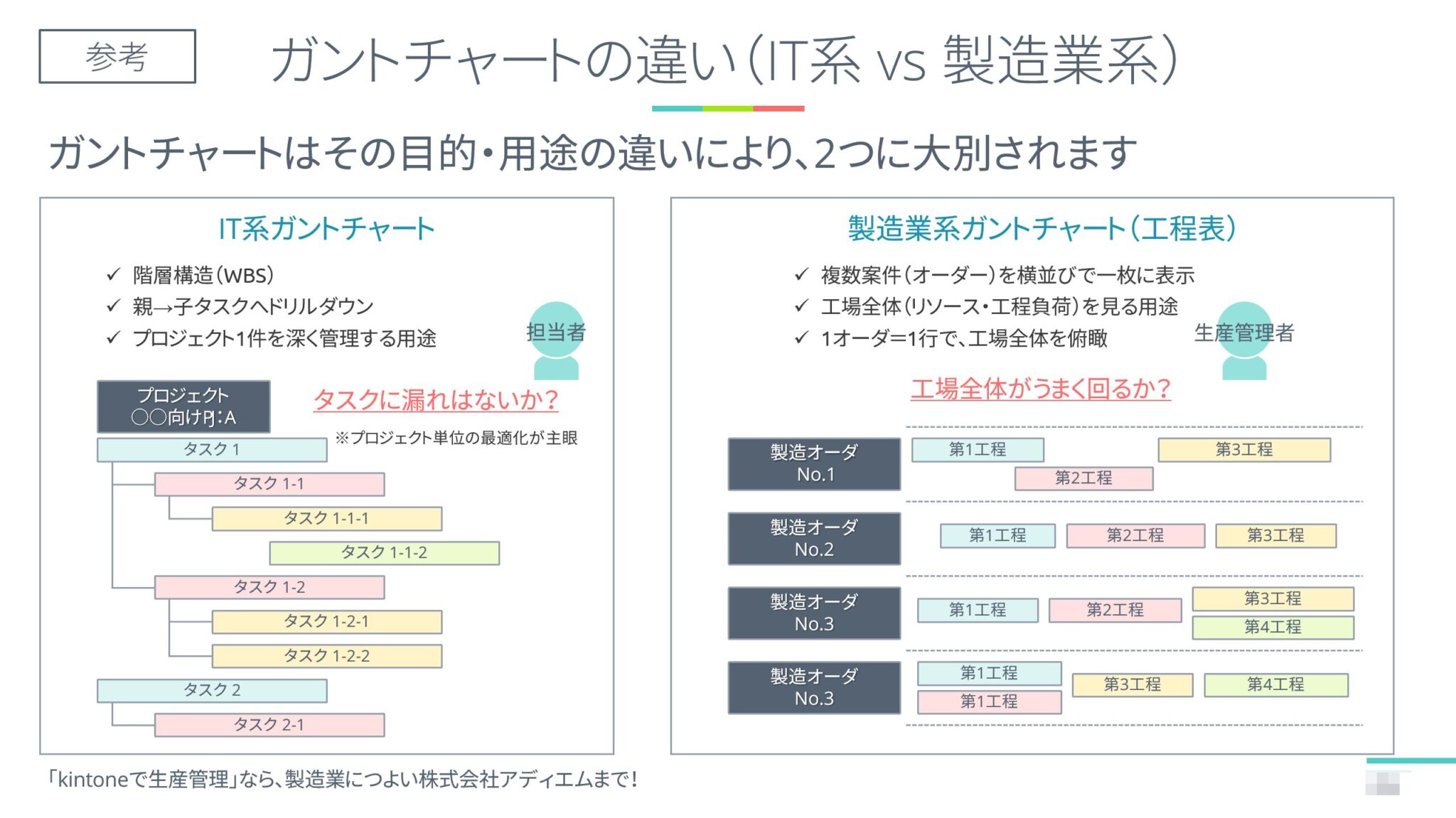 - リソース(設備・人)の割当や負荷バランスの調整が難しい。