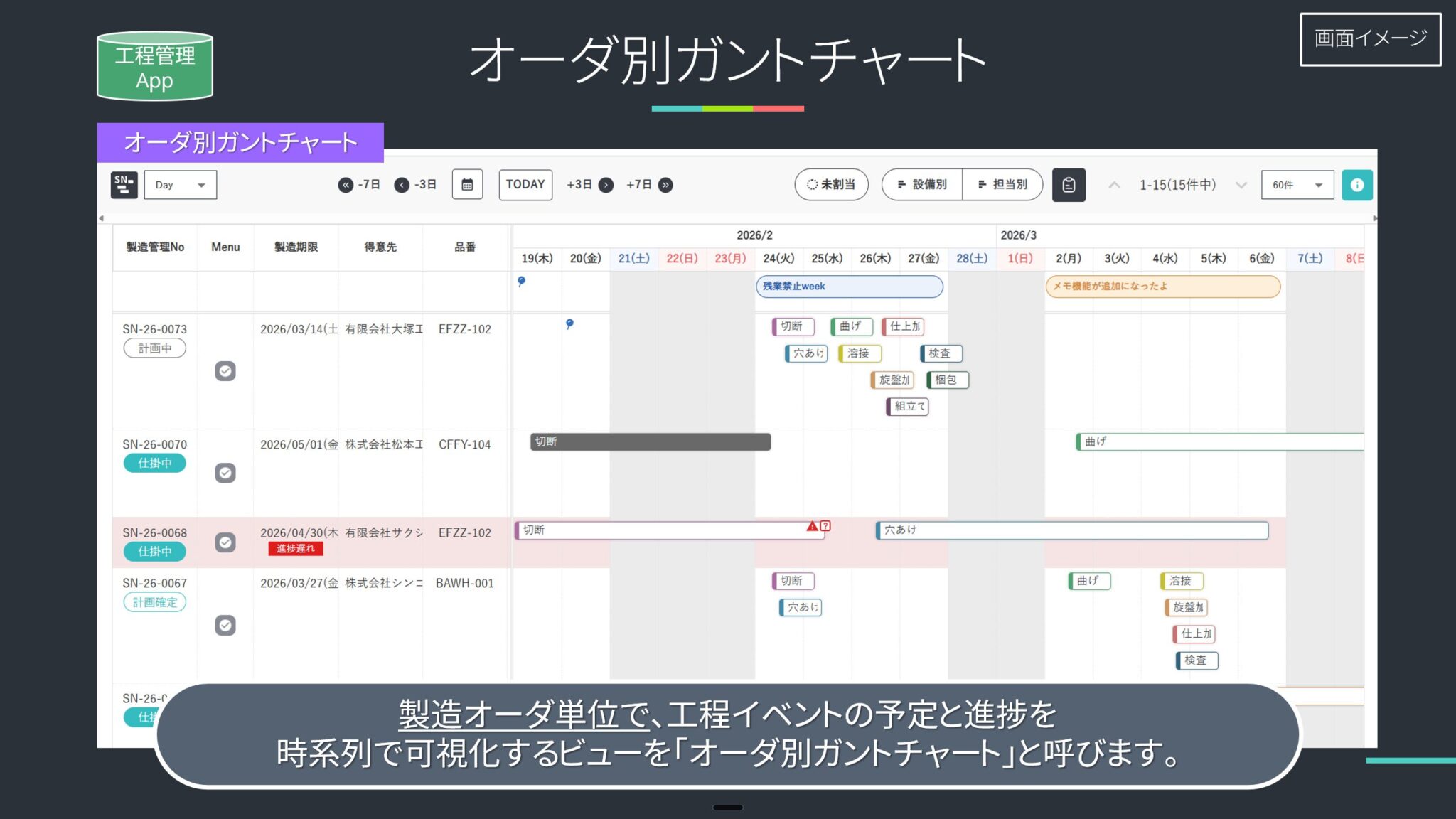 - オーダ別ガントチャート:納期に間に合っているかを確認
