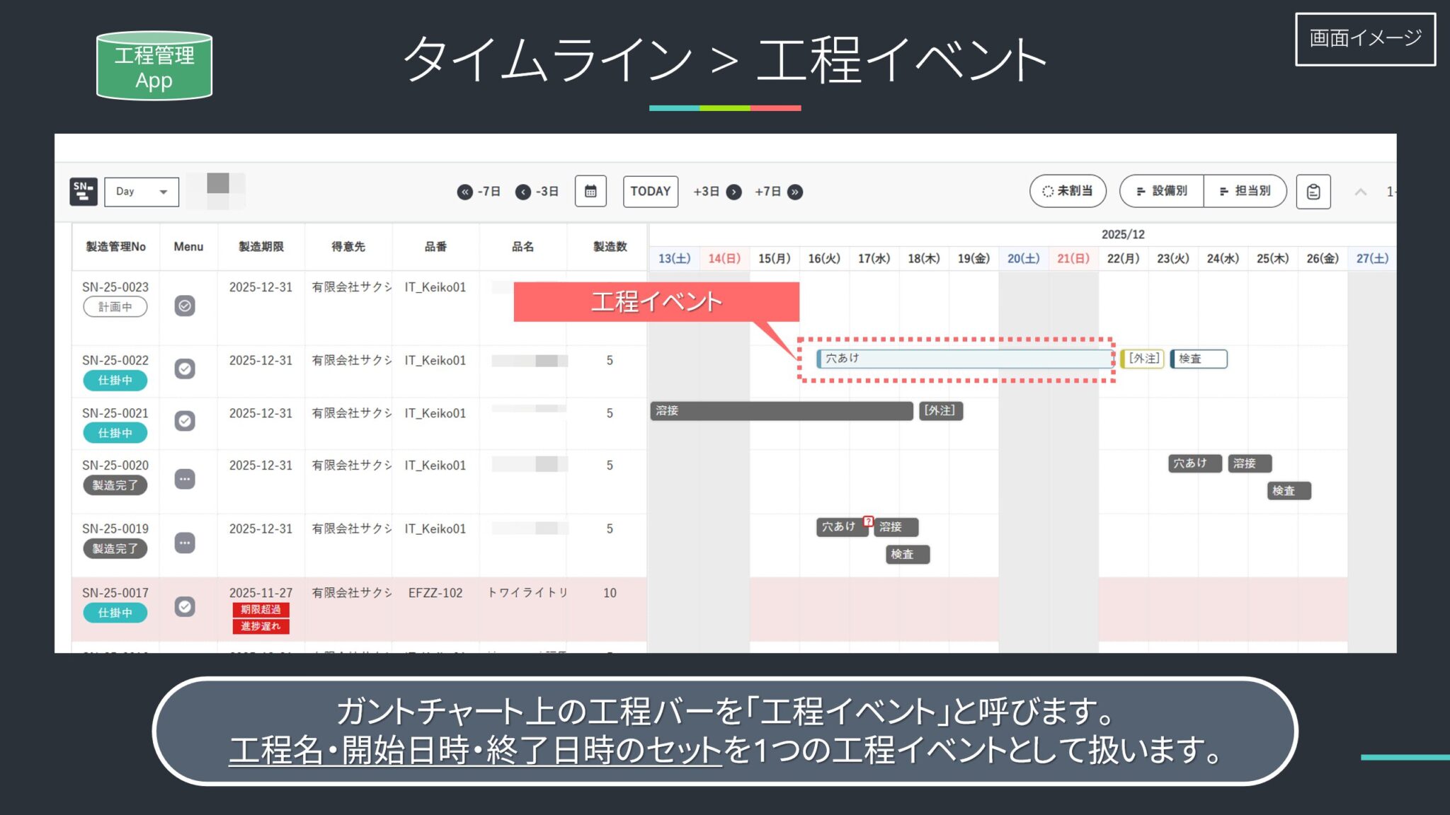 - 対象の工程を選択すると、その工程を含む製造オーダーに属するすべての工程イベントがガントチャートに絞り込み表示されます