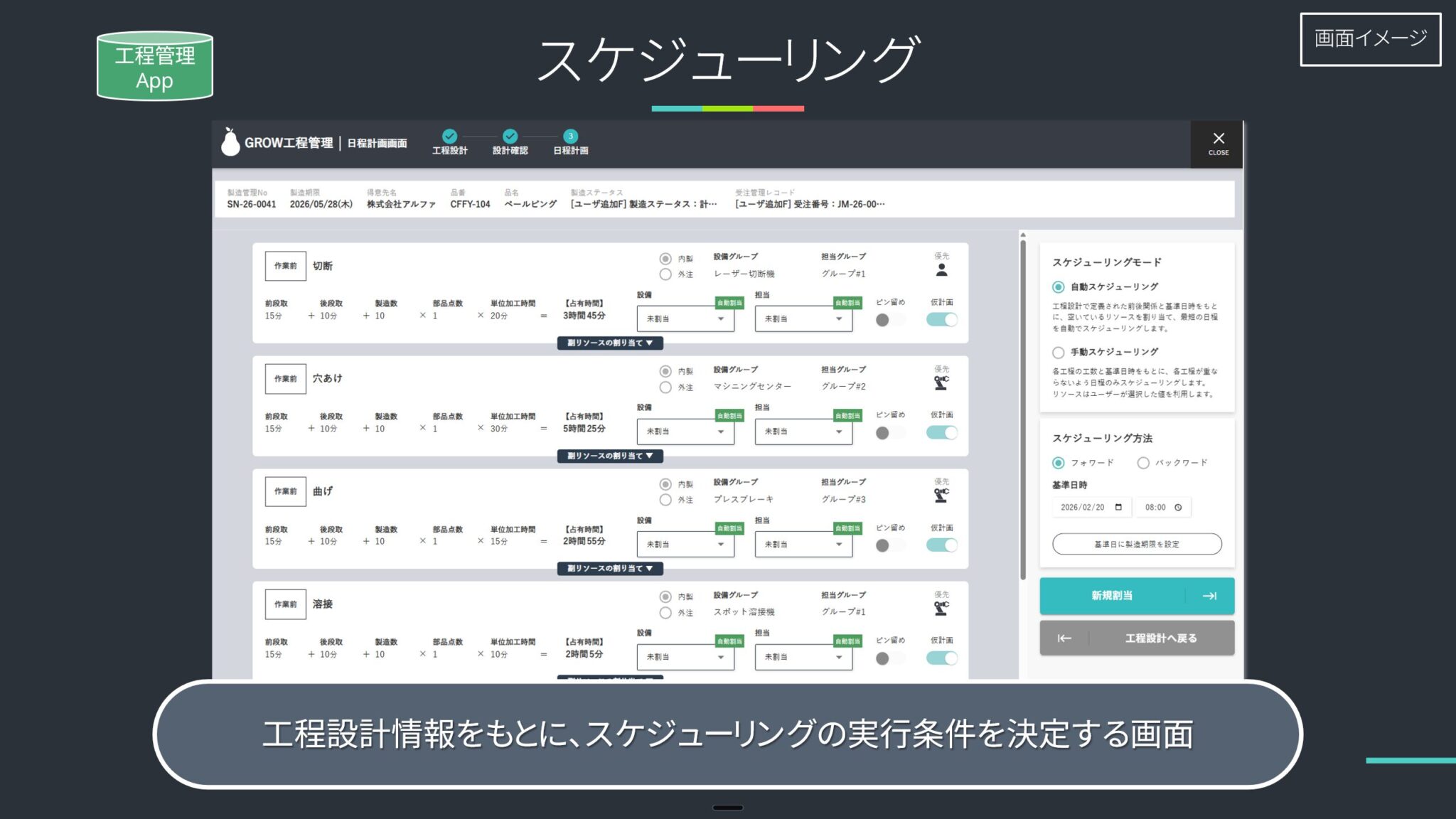 - 各工程の設定:設備グループ・担当グループ・標準時間を入力