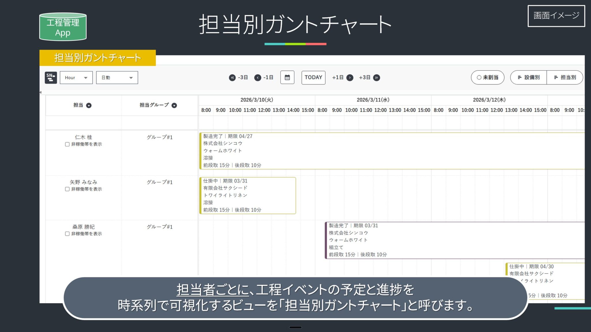 - 工程バーをクリック→ダイアログ:担当者・設備を変更