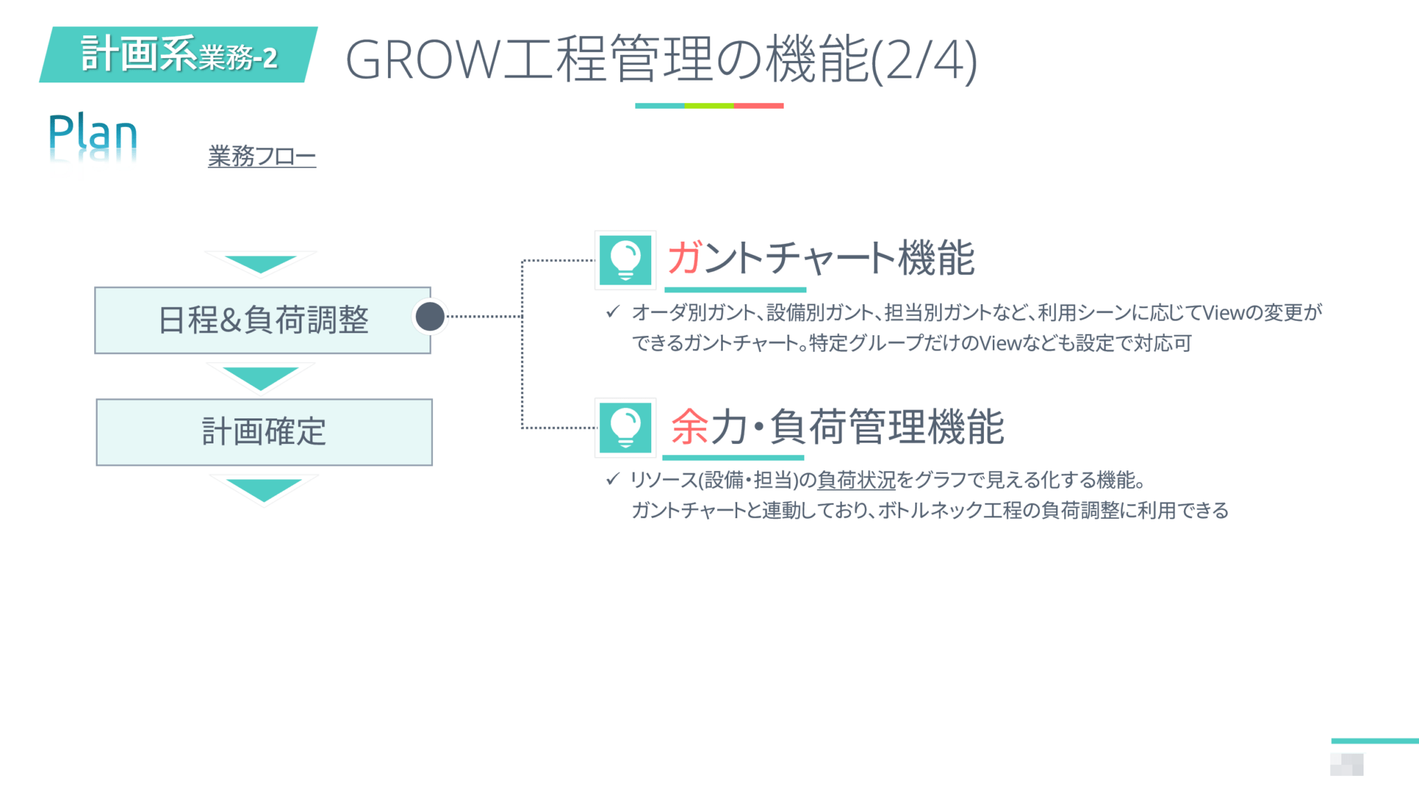 - 余力・負荷管理:設備・担当の負荷状況を可視化し、無理のない計画かを確認。