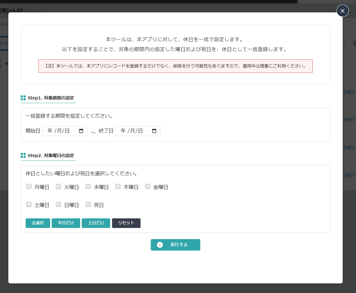 注意:対象期間にすでに登録済みの休日がある場合、二重登録になる場合があります。実行前に既存データを確認してください。