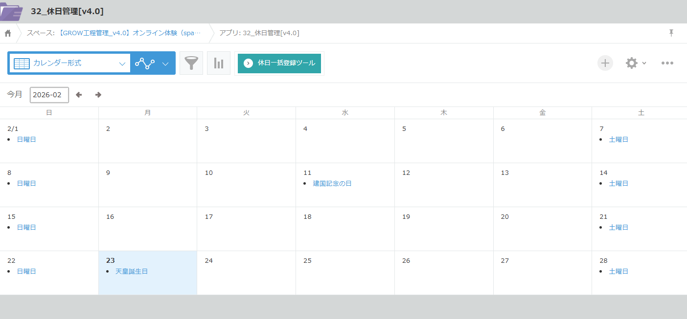 1件ずつ手動登録する代わりに、休日一括登録ツールを使うと、指定した期間の土日・祝日をまとめて登録できます。