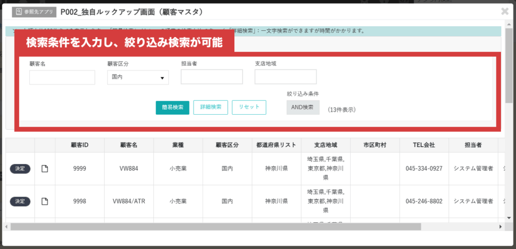 | 1-2 | ルックアップ画面上での検索条件指定 | モーダル画面上の検索項目/表示項目を自由に設定することができます | |