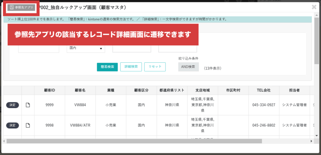 | 5 | レコード詳細画面への遷移機能 | 検索結果一覧表のアイコンをクリックすると参照先アプリの該当するレコードの詳細画面に遷移できます |