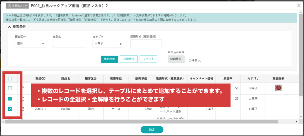 モーダル画面上で複数のレコードを選択し、テーブルにまとめて追加することができます。