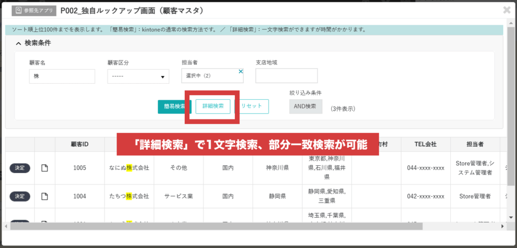 「詳細検索」で、kintone標準ではできない、日本語の1文字検索や、英数字の部分一致検索ができる機能です。