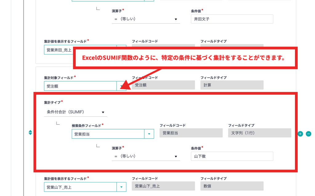 さらに、条件付き集計(SUMIF)は複数設定できるから、1つの関連レコードに対して「営業担当別の受注額」と「製品カテゴリ別の受注額」のように、複数の集計が可能です。