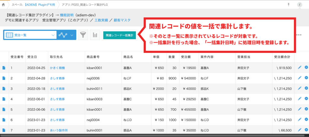 大丈夫です!当プラグインでは、レコード一覧画面上のボタンをクリックするだけで、一覧で表示中の複数レコードを対象に関連レコードの集計ができるんです!