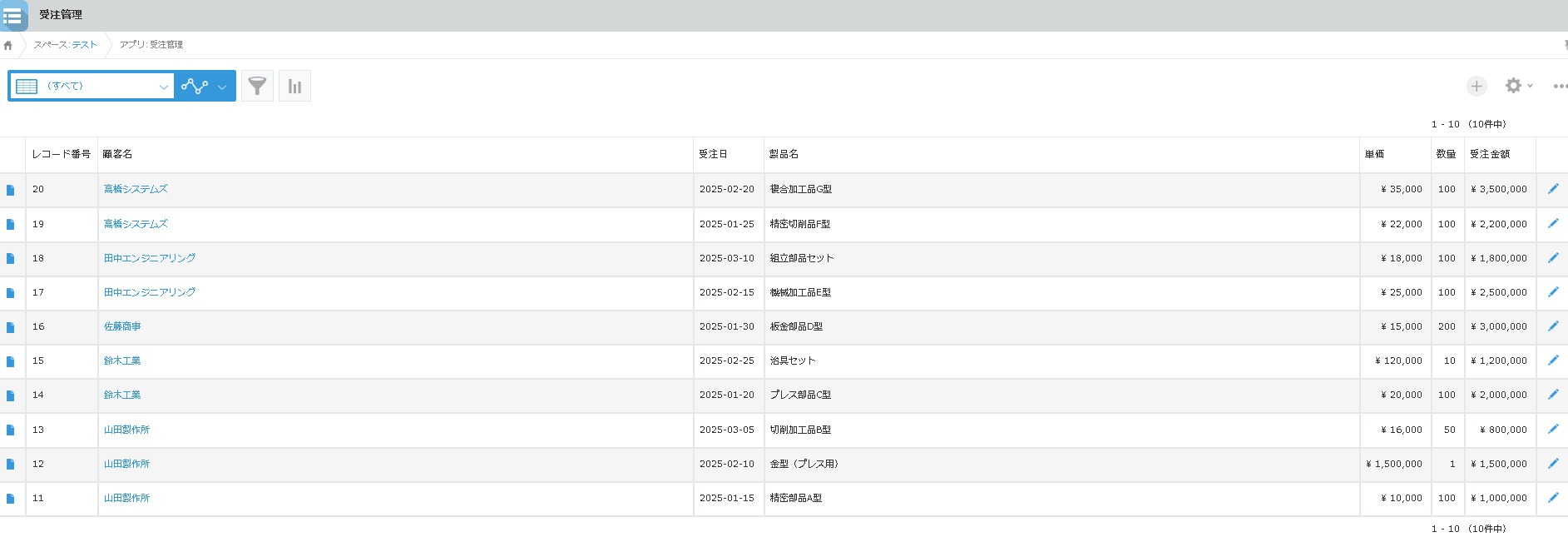 顧客管理アプリで山田製作所のレコードを開くと、関連レコード一覧で3件の受注履歴が表示されます。