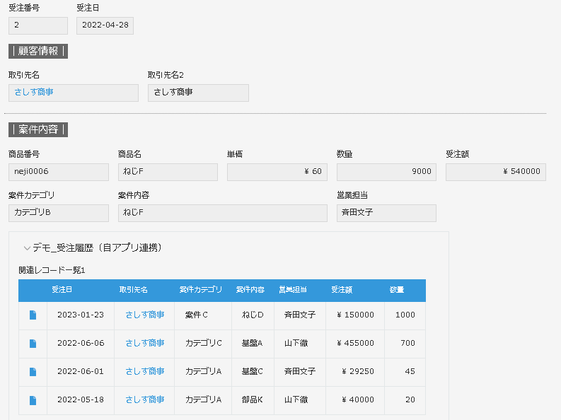 顧客ごとの受注履歴も見れたらいいよねということで、関連レコード一覧で表示しています。